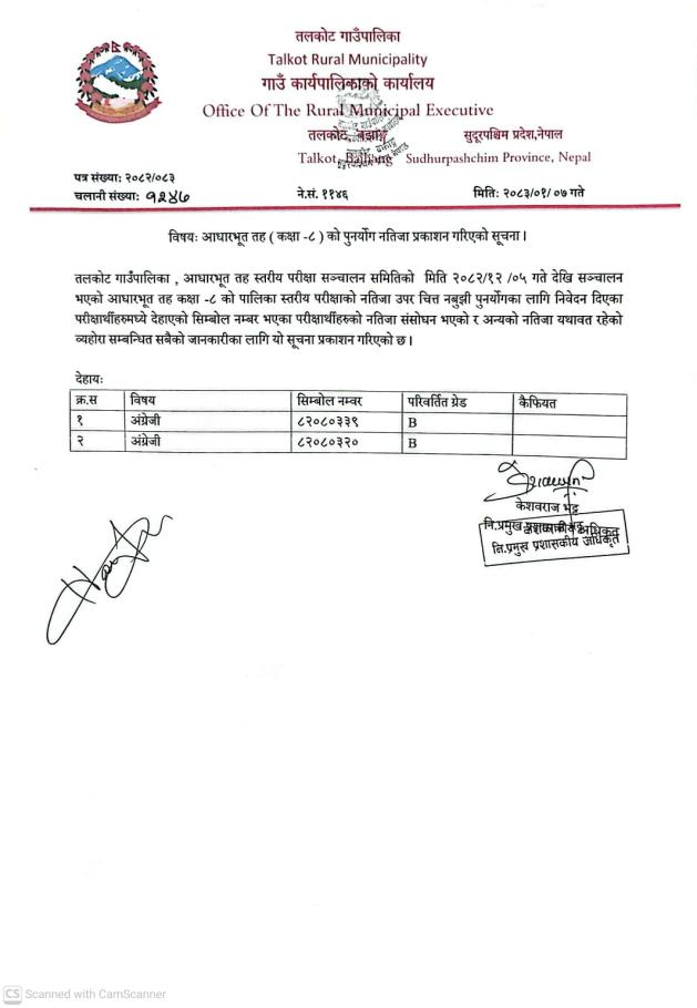 आधारभुत तह (कक्षा-८) को पुनर्योग नतिजा प्रकाशन गरिएको सूचना!!!