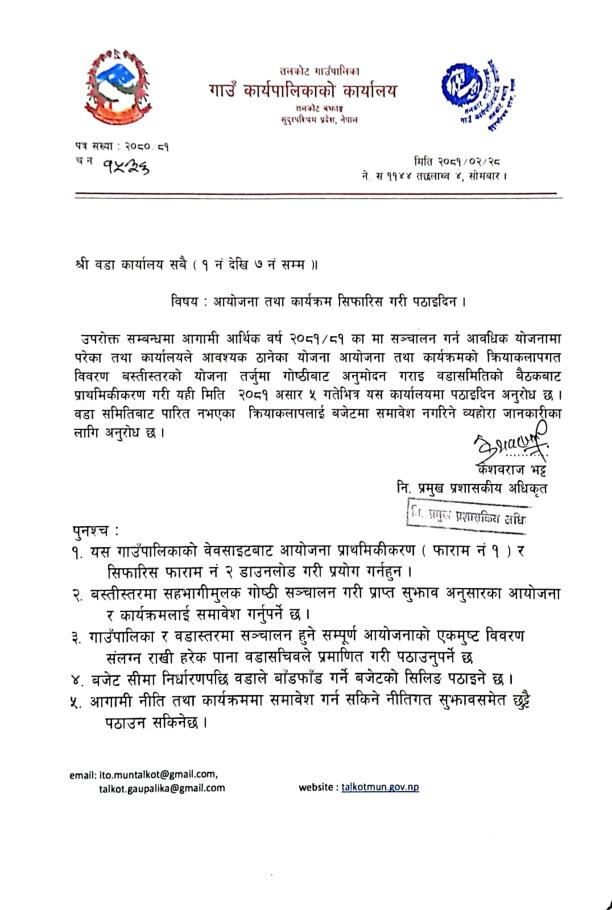 आयोजना तथा कार्यक्रम सिफारिस गरि पठाइदिन ।