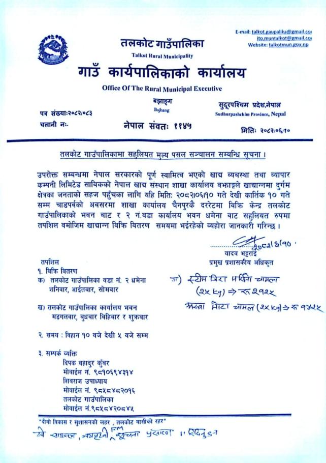 » तलकोट गाउँपालिकामा सहुलियत मूल्य पसल सञ्चालन सम्बन्धि सूचना !!!